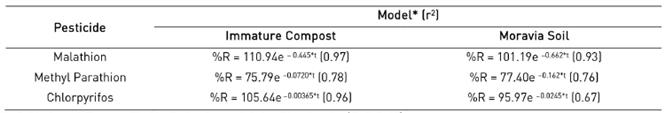 The ability of the microorganisms of the IC and MS matrices to degrade the three pesticides was similar. The highest rate of degradation was seen for malathion, followed by methyl parathion and finally chlorpyrifos [Figures 1 and 2). This greater persistence of chlorpyrifos has been reported previously [25]. Pesticide degradation models in both the IC and the MS matrices, as well as their correlation coefficients (r2 ), are shown in Table 2.