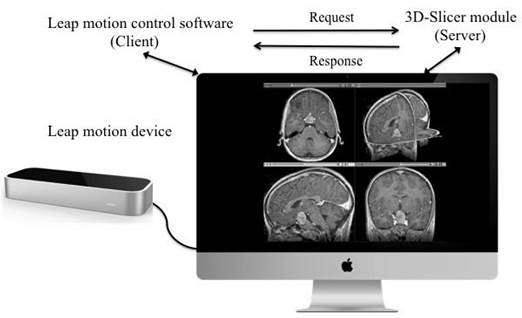 A module that recognizes the Leap Motion (LM) as an input device was developed in 3D-Slicer, it was developed in Python programming language because it includes libraries for the communication protocol (TCP-IP) used as sockets and is supported by Leap Motion and 3D-Slicer. Objects in 3D-Slicer as diagnostic images and 3D models have attributes such as size, orientation, position in space that can be modified using python (see Figure 3].