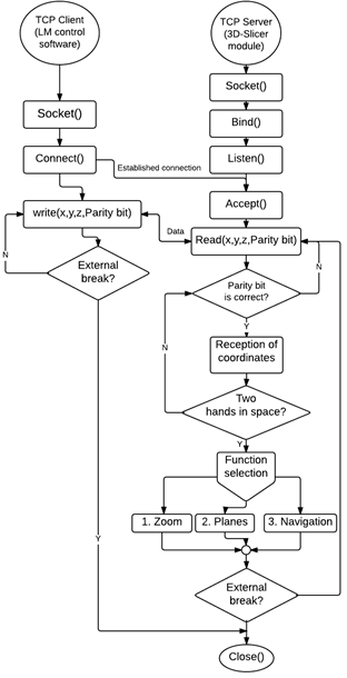 The overall algorithm used is shown in the Figure 5. Once the communication has started, the LM transmits the (x, y, z) coordinates of the fingers in LM scene and parity bit that ensures the integrity and data availability. The default function is zoomed on images. When the LM detects two hands it switches to other functionality, which may be either the movement of anatomical planes or the navigation in a 3D space. The information is sent to the serveronly if there are objects on the LM physical space.