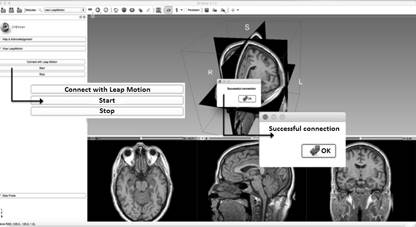 The communication is initiated by the LM through a port number to find the Slicer program. The LM includes a python library that enables the capture of the gestures; in our case each nine millisecond, and according the current gesture a predefined code is transmitted to the 3D-Slicer software. Additional to the gestures, the LM captures the position of each finger. That information is also sent to the visualization software.