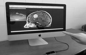 To select another anatomical plane, four fingers on the space defined by the LM should be placed, and the change takes place immediately (see Figure7(b));for the case shown in Figure 8, the sagittal plane was selected and a point located in a patient's tumor became the center of the image and the zoom was performed on this area, allowing users to examine this specific area without using the keyboard or other physical input device.