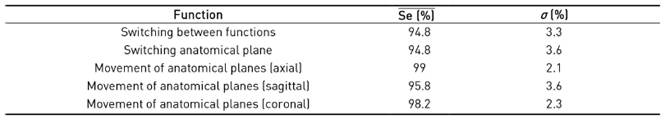 The sensitivity results and positive predictive values in the recognition of gestures show the good performance of the system for real-time applications and ensure the proper functioning of its use for non-experienced users. The diagnostic imagescontrolusingthe module can deplete the user after a few minutes of interaction by keeping the hand raised and the working range of the leap motion may be a limiting factor when working within an operating room (approximately 1.2 meters from the device). Personnel who need to manipulate diagnostic imaging should be close to the working range of the sensor to control the images and have their hands free to manipulate the diagnostic images.Nevertheless, the personnel need to be close to the images, also to see clearly the details, therefore, 1.2 meters is an acceptable working distance if both issues are taken into account.Additional limitations will arise when clinical trial will be done, issues concerning the comfort when the hand isrised or movement artifacts will need a rigorous future study.