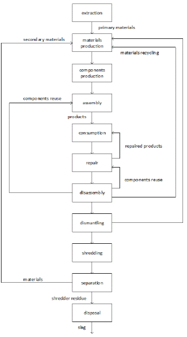 “Recycling means reusing a material or a component or a product not necessarily in its original form”7. The adoption of recycling techniques allied with good design practice can do much to conserve raw materials and energy if we allow for materials and components to be reclaimed from products after their useful life is over, we minimize waste and we save money. Waste minimization followed by recycling does offer the potential for considerable savings without major sacrifices on the part of the consumer. Figures 1 and 2 depict the life process of a product and an electrical machine respectively8. Recycling may take place at the end-of-life of an electrical machine or at any stage of the life process of an electrical machine9.
