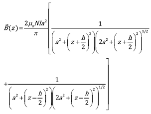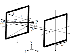 Helmholtz configuration consists in a pair of coils located parallel on either side of the test area along a common axis (in this case z-axis), spaced at a distance h as shown in Figure 223; where each black thick line represents a square coil of conductive wire, a is the half side length of the coil, P is the evaluated point and s is the perpendicular distance from the current loop axis ( on x-axis) to P. Each coil consists of N turns and the relationship between the side and the separation distance for square Helmholtz coils is given by a factor of 0.5445 (h=1.089a)6, these physical parameters depend on the restrictions of the application in terms of the desired volume with a uniform magnetic field. The square coils are connected in series generating a highly uniform magnetic field on the axis of symmetry (z-axis); therefore solving (1) for x=y=0 the resultant magnetic field is equal to the Bz component because the other (Bx and By ) components are zero 23 and it is calculated by the following Eq. (2):