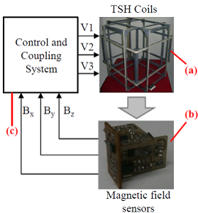 The complete system configuration is shown in the experimental arrangement of Figure 6 where the control and coupling system can be observed, TSH coils system, measurement system and auxiliary equipment of power and registration. The system operation can be in open or closed loop depending on the application. The open loop operation is limited to the generation of a uniform magnetic field on each coordinate axis without control. Meanwhile, the closed loop operation allows the control of the generated magnetic field on each coordinate axis, giving the possibility of attenuation of the ambient magnetic fields such as the geomagnetic field.