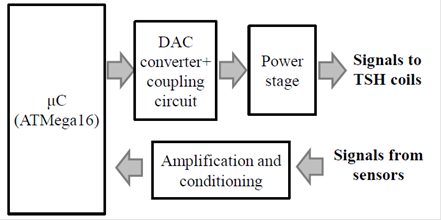 Figure 3 shows the control and coupling system which is divided into several components such as the amplification and conditioning stage, microcontroller, Digital/Analog Converters (DAC) and power stage.