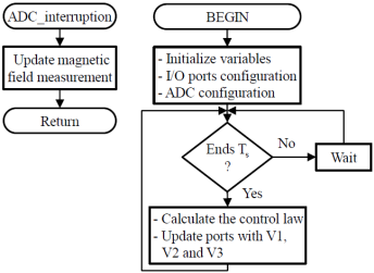 A continuous comparison between the reference and measured signals is performed by the digital control system. If the reference signals are greater than the measured, the control system will increase the generated magnetic fields by the TSH coils. Likewise, if the reference signals are less than the measured, the control system will reduce the generated magnetic fields by the TSH coils. Eventually, in steady state conditions the difference between both magnetic fields will be insignificant, ideally zero. The flowchart of the program in the microcontroller is shown in Figure 4, where the ADC interruption routine that update the measurements and the main routine can be observed.