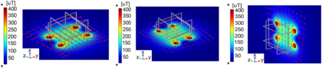 Experimental results6 ensure an average cubic volume of side length 0.12 m (homogeneity 0.45 %) with uniform magnetic field around the center of the TSH coils. The average measured magnetic field obtained was 204 μT in the center of separation of each coil pair. The maximum error found between measured and simulated values was 7.4 %, this error is associated in part to the uncertainty of the measurement process (ambient conditions, resolution of measuring equipment, etc.) and the numerical methods (mathematical approaches) used by the simulation software to find the solution. Finally, the resolution of the measurement system was 1 μT.