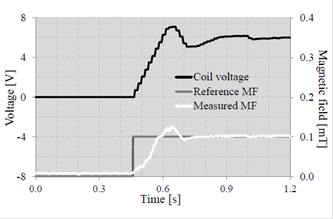 The operation of the magnetic field control system by setting a reference value of 0.1 mT in the Bz component was checked. Therefore, the control action is made on the applied voltage to the pair 1 of the TSH coils system (see Figure 5(a)). Figure 7 shows the response of the magnetic field control system to a reference value of 0.1 mT, where a good monitoring of the reference signal can be observed with a steady state error close to zero and a stabilization time approximately 0.24 seconds. This stabilization time is due to the restriction of the maximum change of the output voltage which was set at +1 V, in order to avoid high voltage peaks and large variations in the electric current of the coils.
