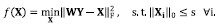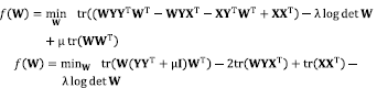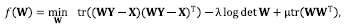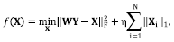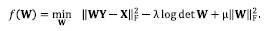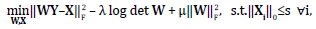 Where X is column-sparse, and ║·║F is the Frobenius norm Note that, in Eq. (3) the log det W term penalizes the transforms with small determinants, helping to obtain a full rank transform W, thus avoiding trivial solutions, such as those composed by repeated rows. Similarly, the