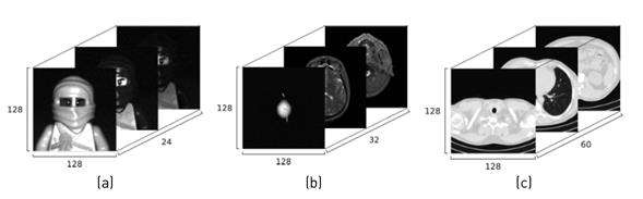 Several experiments with real multidimensional images were conducted to show the benefits of the proposed algorithm. Experiments were performed using three test multidimensional signals shown in Figure 2: an hyperspectral image (HSI) composed of a section of a Lego scene with spatial resolution of 128 x 128, with 24 spectral bands(24); a magnetic resonance image (MRI) composed of a resized scene of a head scan, property of the U.S. National Library of Medicine(25), with dimensions 128 x 128 x 32; and a computerized axial tomography scan (CAT) image of a human thorax acquired with a computed tomography scanner Toshiba Aquilion 64 with dimensions 128 x 128 x 60.