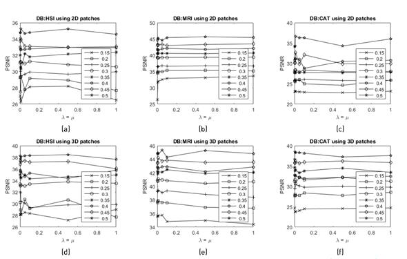 In particular, three sets of experiments were performed to test the proposed algorithm using the three multidimensional images shown in Figure 2. In the first experiment, we perform a sensitive analysis of the regularization parameters λ and μ, seeking for the best values, since their correct selection highly impacts the final result. In the second experiment, we compare the performance of the proposed algorithm using either 2D and 3D patches with the best regularization parameters found in Experiment #1, against analytical transforms such as DCT and the identity, and the state of the art dictionary learning algorithm K-SVD 17. In order to quantify the reconstruction quality of the multidimensional test images from the learned dictionary W, the peak signal-to-noise ratio (PSNR) metric was calculated. The third experiment analyzes the concentration of the non-zero values of the signals after being represented on the attained dictionaries. The higher the concentration of the non-zero values, the better the representation dictionary.