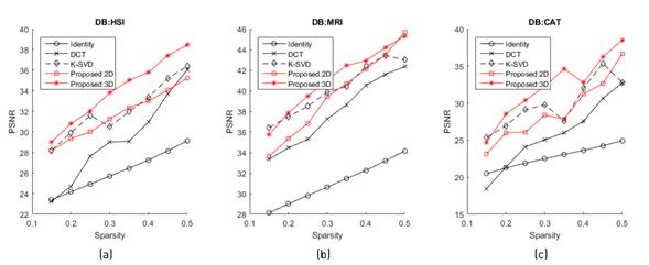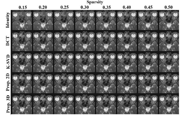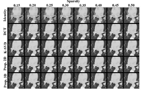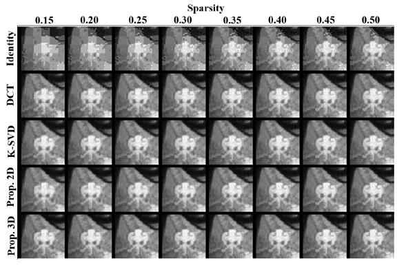 In order to test the accuracy of the proposed algorithm to create sparsifying dictionaries, we compare it against analytical dictionaries obtained through the DCT and the identity matrix. Moreover, we compare the proposed method against the widely-used state of the art dictionary learning algorithm K-SVD, which has shown to be reliable. Figure 4 summarizes several simulations that were performed varying the sparsity level of the signals to be represented by the dictionary. Note that the best regularization parameters were used for the proposed algorithm using either 2D or 3D patches, as given in Table 1.