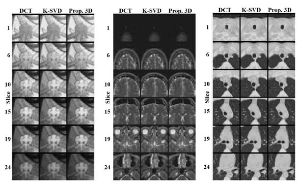 In Figure 8, a comparison of the footprints of 6 different slices along the third dimension of the three test databases is shown, in order to analyze the performance of the best analytical (DCT), the K-SVD and the best proposed method (using 3D patches). It can be observed from the figure that each algorithm performs consistently along the third dimension, with the K-SVD and the proposed method attaining the best quality.