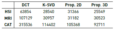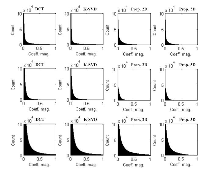 This experiment analyzes the concentration of the non-zero values of the signals after being represented on the trained dictionaries. For each multidimensional sparse representation in each dictionary, a threshold is applied to remove the values close to zero, in order to observe the non-zero coefficients with higher magnitudes; that is, the most representative coefficients. Table 2 shows a comparison of the number of non-zero coefficients attained after applying a threshold to the normalized magnitudes lower than 0.03. It can be observed that the number of non-zero coefficients is lower for the learned dictionaries than that of the DCT, and between the learned dictionaries, the proposed method using 3D patches attain the sparsest representations.