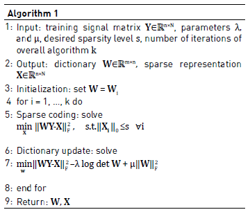 In this section, an algorithm is proposed to solve the problem in Eq. (3). This algorithm alternates between two stages, a sparse coding stage in which the problem seeks to find sparse representations X of the training signals Y, fixing the transform basis W; followed by a dictionary update stage, where the transform W is updated by fixing the just found sparse representation X. The stages are detailed as follows: