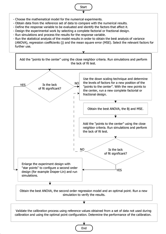 The methodology used for the hydrodynamic-numerical model calibration and validation is based on that of the response surface. It includes the analysis of lack of fit through the neighbor nodes and the down-scaling technique, which makes it appropriate to apply a numerical experimentation with deterministic mathematical models1) (2. The contribution of this methodology to the classical DOE methodology applied to physical experimentation is the inclusion of near neighbor points in the lack of fit test, instead of using exact points to the center. The developed methodology flow chart is shown in Figure 1, where it is compared to the classical DOE methodology presented by Gutiérrez and Vara1 and Montgomery2. The difference is easy to detect if we perform the lack of fit test without replication. This methodology is applied to the simulation of a curved channel open flow.