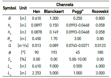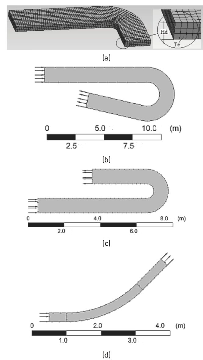 Water depths in a curved channel measured by Han et al.12 were used for the calibration of the numerical parameters of the model (see channel geometry in Figure 2(a)); and water depths measured by Blanckaert, Rozovskii and Poggi 13) (14) (15) (16) (17) (18 (see Figures 2(b), 2(c) and 2(d) for channels geometry) were used for validation. The flow characteristics and channel dimensions for each test case are presented in Table 1, (where B: channel width; he: water depth at the channel entrance; hs: water depth at the channel exit; Rm: mean radius of the channel; Q: discharge; (: development angle of the channel curve; So: longitudinal slope; Le: straight zone of the channel upstream the entrance; Ls: straight zone downstream the exit).