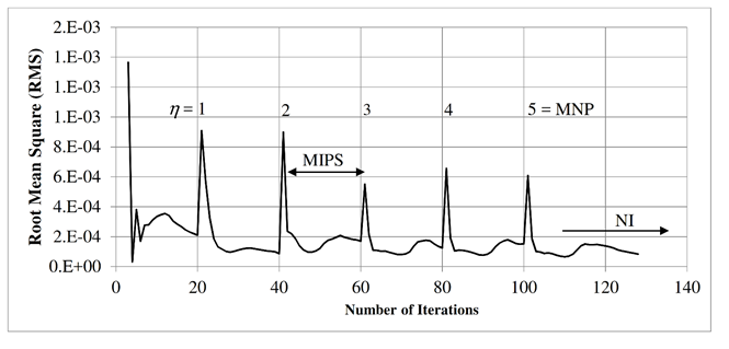 whereS( is the number of additional nodes for every iteration step; MNP is the maximum number of iteration steps; M is the number of new nodes to be distributed in the domain and is computed as M =NDi*NF, where NDi is the initial number of nodes which depends on the domain size defined by Hd and Te (see Figure 2(a)), and NF is the node factor that allows the user to define the total number of nodes to be added; NAP is a parameter related to how the nodes are added to the computational domain (if positive, nodes are added at the beginning of the simulation; if negative, nodes are added at the end of the simulation; and if it is zero, nodes are added evenly distributed during every grid adaptation step); and ( represents each one of the adaptation steps and varies between 1 and MNP. In addition to the previous geometric factors, the numerical model includes two numerical factors related to the iteration process: a) the MIPS factor that indicates the maximum number of iterations per computational step of the adaptive grid, and b) the NI factor that represents the maximum number of steps (iterations) for convergence. In Figure 3, a graphic representation of the MIPS, MNP, ( and NI factors when the RMS error is plotted as a function of the number of iterations is shown (Figure 3 was obtained for MNP = 5 and MIPS = 20). Once the rα and rβ fractions are known, the grid adaptation procedure is used for a region near the water-air interface, adding more nodes where the answer variable shows steeper gradients.