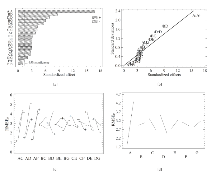 In order to obtain the best ANOVA, a confidence interval of 5% was defined, including in the error some double interactions of smaller significance1) (2. For practical purposes, Eq. (6) was rewritten in the form RMSEP = f(A, B, C, D, E, F, G), where there is a correspondence between the factor in Eq. (6) and its rewritten form. The linear regression model obtained for the best ANOVA is: RMSEP = 2.92831 + 1.27684*A + 0.0741274*B - 0.32016*C - 0.52464*D + 0.247451*E - 0.104724*F + 0.160621*G + 0.227865*A*C - 0.322946*A*D + 0.291371*A*F - 0.228789*B*C - 0.657372*B*D + 0.233018*B*E - 0.458708*B*G - 0.205209*C*E - 0.209814*C*F - 0.427151*D*E + 0.228444*D*G, where the factors are in encoded values.