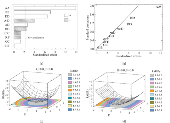 In search for the optimal model, the Draper-Lin model, built out of the 24 factorial design, was chosen for the experiment design. In this case, the same “points to the center” used for the lack of fit test were added and the “star-points” were also added to guarantee an orthogonal and rotatable design. After the best ANOVA analysis, the new regression model, now a second order model, was obtained as: RMSEP = 1.15325 - 0.205049*D + 0.00933529*B - 0.0449354*C - 0.0446673*F + 0.365531*D^2 + 0.17816*D*F + 0.216632*B^2 - 0.161874*B*F + 0.0402612*C^2 + 0.199838*F^2, where the RMSEP is expressed in percentage and the level of factors are scaled as mentioned earlier. In this new equation, it is clear that the second order terms have high relevance, indicated by the relative high values of the regression coefficients. These results are validated by the Pareto diagram (Figure 5(a)), the Daniels plot (Figure 5(b)) and the “p-value” of the regression coefficients.