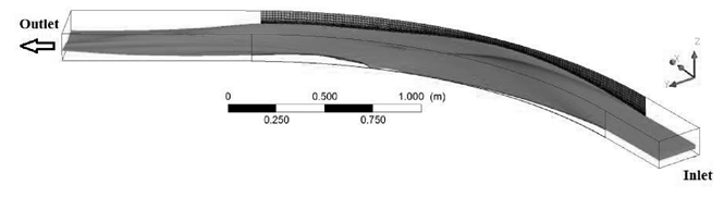 The numerical simulations in this work were performed by an Eulerian-Eulerian hydrodynamic model for the conservation of mass and momentum laws. It was applied to a two-phase flow of water and air, in order to find the interface surface between these two fluids, which is useful for the study of flow in open channels when the water surface is to be determined 10) (11. Taking into account that it is necessary to compare predicted values with reference (experimental) ones for the calibration of the hydrodynamic model, experimental values reported in the literature for water depths in a curved open-channel flow were used in this case. Specifically, data reported by Han et al12 were used for calibration, and data reported by Blanckaert, Rozovskii and Poggi, were used for validation13) (14) (15) (16) (17) (18.