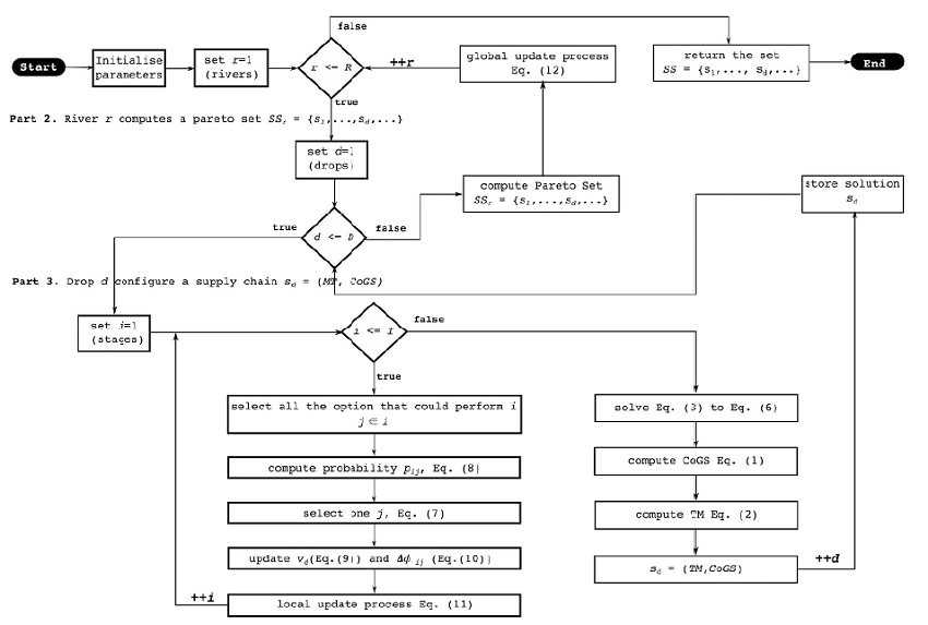 The novelty in this work is to compare the performance of the proposed IWD algorithm with exhaustive enumeration for an instance size that the optimum Pareto set can be computed. Moreover, the model in this paper considers more than one option to perform a stage, contrary to what is done in the aforementioned proposal. In relation to the application of IWD to the SCD problem, there is no published attempt to solve the bi-objective SC configuration by means of IWD as shown in recent surveys specialised in SC design problem [15-17].