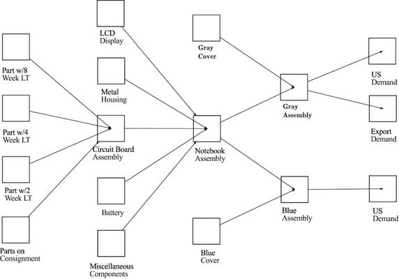 of differentiation where either the Grey or Blue cover is included. The tree structure, in Figure 2, shows the components and operations that are required to manufacture the products and deliver them to markets. For each product, four types of components are required to produce a circuit board assembly, which is then assembled with an LCD display, a metal housing, a battery, and various other components to produce a notebook subassembly. The notebook subassembly is then integrated with either the Grey or the Blue cover to make up the final products.