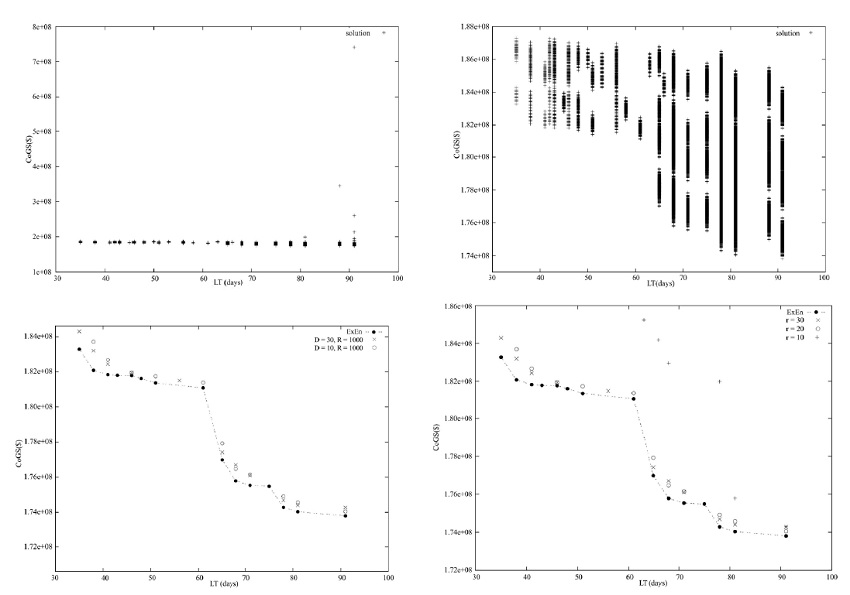 The hybrid metrics called Hypervolume (H) and H Ratio (HR) are related to the coverage area of a solution set in relation to the solution space, i.e. H and HR add the rectangle areas bounded by a reference point. For instance 1, the reference point is LT = 91 and CoGS=187,039,500, hence the value of H is greater when R=30, i.e. about 94% of the area is covered by the solution set when R=30. On the other hand, when R=10 just 9% of the area is covered. According to the values of GD, S, H, and HR in instance 1, we concluded that the best solution set computed by our proposed algorithm is when thirty rivers are created.
