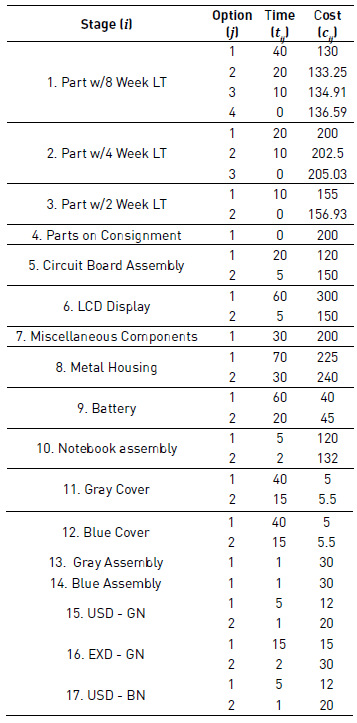 In this paper, the SC representation proposed by [6] is used. There are I stages (i=1,2,…,I ) and every stage has Ji possible options (j=1,2,…,Ji ) that can perform it. Every option ji has a cost (cij ) and time (tij ) associated, and for any pair of options j and j' that can perform the stage i their cost and time have the following relationship: cij > cij’ ( tij > tij’ or cij ( cij’ ( tij ( tij’ .