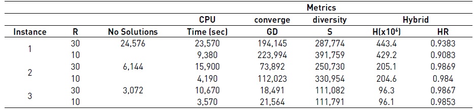 A similar analysis can be carried out in instances 2 and 3. As shown in Table 2, the values of the metrics when R=30 outperform the values of the same metrics when R=10 but in the H and HR in which their values are similar. It means that in instances 1 and 2 the area, covered by either of the solution sets, covers about 98% of the solution space area.