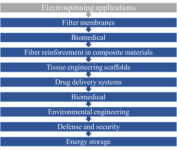 Electrospinning is an old technique. It was first observed in 1897 by Rayleigh, studied in detail by Zeleny on electrospraying in 1914, and patented by Formhals in 1934 [1]. The electrospinning process may be considered the most promising of all nanotechnologies, due to versatility and cost to produce nanofibers [2, 3], with large surface area, porosity, orientation, and dimensions in a controlled manner with excellent mechanical and easy functionalization properties for multiple applications [2] [3-8]. This technique has a variety of applications such as it is shown in Figure 1.