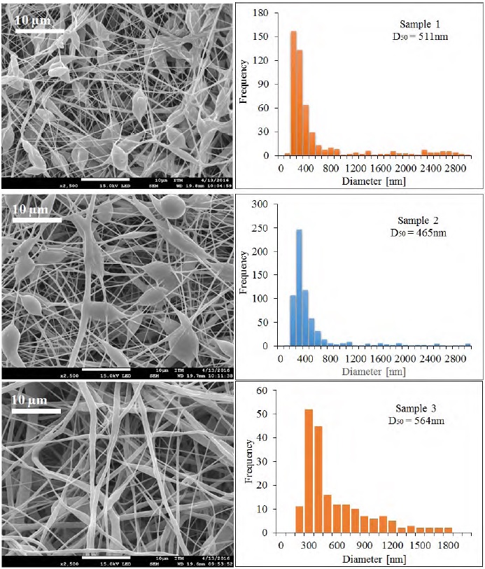 The study of the morphology of the fibers was performed using a Field Emission Electron Microscope (JEOL, JSM-7100F) with an accelerating voltage of 15 kV. The nanofiber samples were sputter coated with a 2 nm thick gold film before measurements. The fiber diameters were determined using Image J software. At least 250 nanofibers in different SEM images were analyzed for each sample.