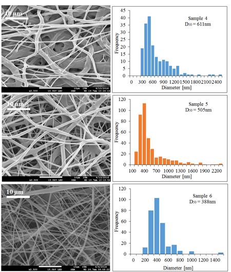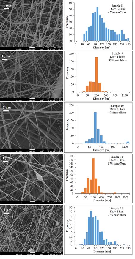 PLC trials with Mw 45,000 g·mol-1 were also performed, to see the effect of molecular weight and other operating conditions in the production of fibers. Sample 7 was not possible to electrospinning because the polymer concentration was very low, this caused that the polymer solution was very fluid and droplets dropped down continuously from the tip of the needle. The SEM images and diameter distribution histograms of samples 8 to 12 are shown in Figure 6.