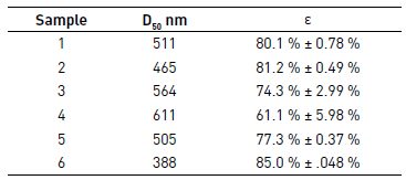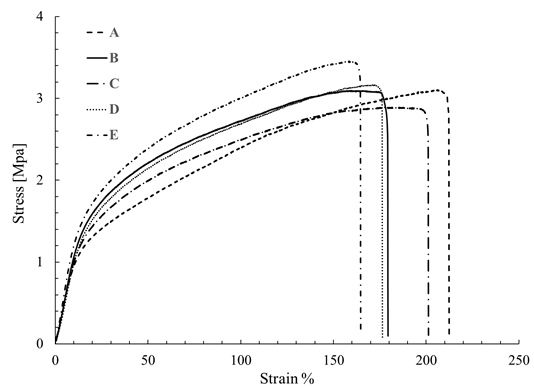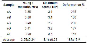 Sample 6 was selected for mechanical testing because this presented the best morphology regarding the other samples of PCL of Mw 80,000 g·mol-1 and lower average diameter of the fibers. Different fragments of Sample 6 were mounted on the texturometer, and then it rolled in order to determine the elastic modulus, the stress at rupture and deformation. These properties were tested by analyzing five samples; the results are presented in Table 6 and Figure 8 shows the curves of stress-strain. In the case of PCL films of Mw 45,000 g·mol-1 and 14,000 g·mol-1 was not possible to determine the mechanical properties, because the difficulty to separate the film of the aluminum foil due to its low thickness.