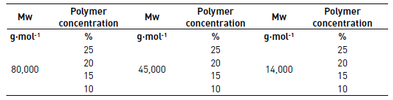 PCL solutions with three different molecular weights (Mw) 14,000 g(mol-1, 45,000 g(mol-1 and 80,000 g(mol-1 were prepared at concentrations of 10%, 15%, 20% and 25% of the polymer in acetone to be evaluated qualitatively in the process of electrospinning and defined if these solutions had the potential to be electrospun. Each solution was taken to the electrospinning equipment to 15 kV, an injection rate of 0.5 mL/h and the collector was positioned to 15 cm. The solutions for qualitative evaluation of electrospinning are shown in Table 1.