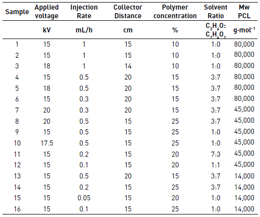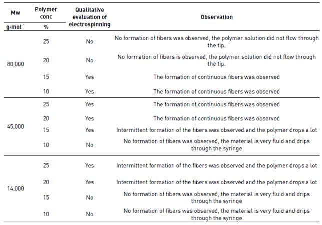 As shown in Table 3, some of the evaluated concentrations of the polymers were discarded for analysis because no fiber formation was observed, due to the high concentration (>20%) of high molecular weight polymer (80,000 g(mol-1) that does not allow the solution to flow through the tip or the low concentration (<15%) of medium (45,000 g(mol-1) and low (14,000 g(mol-1) molecular weight polymers with which are obtained very fluid solutions, that was not suitable for electrospun.