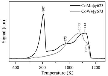 The TPR profiles for the calcined materials are presented in Figure 3. For CoMoϕy623 consistency with the reduction temperatures reported by Brito and Barbosa 25 for β-CoMoO4 were observed. It was established that a reduction to lower valence oxidized states takes place, generating equimolar mixtures of Co2Mo3O8 and Co2MoO4 species, followed by a high-temperature reduction to the metals; these events take place at 807 K and 1113 K respectively. Additionally, a shoulder at 973 K is observed, which can be attributed to the reduction of an amorphous phase impurity obtained when calcination of the lamellar precursor took place. This amorphous phase was not observed by X-ray diffraction.