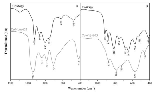 Infrared spectra were obtained for the precursors and the calcined materials (Figure 4). For CoMoϕy, bands at 928 and 620 cm-1 are associated with symmetric O-Mo-O stretching vibrations; the bands at 865, 806, 751 and 475 cm-1 correspond to asymmetric O-Mo-O stretching. All the bands correspond to characteristic vibration modes MoO42- tetrahedra. For CoMoϕy623, bands at 943, 841, 784, 704 and 418 cm-1 are observed, which correspond to the vibration bands of β-CoMoO4 structure 27. This confirms the XRD results, cf. Figure 1(b).