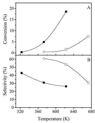 Conversion and selectivity values obtained with CoMoϕy623 and CoMoϕy873, at 100 mLg-1min-1 space velocity to different temperatures, are shown in Table 2. At the same temperature, CoMoϕy873 provided a smaller yield, possibly because of the decrease in the catalyst surface area occurred by the calcination of the precursor at a higher temperature. At higher temperatures, a constant behavior is observed for the selectivity of this catalyst as a function of conversion, within the experimental error. Therefore, the increasing yield obtained with CoMoϕy873 with higher temperature is due to the expected increase in conversion with temperature.