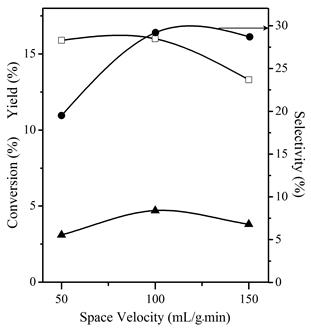 In order to explore CoMoϕy623 as a catalyst, the reaction temperature was fixed at 623 K, and the space velocity was tested between 50 and 150 mL g-1 min-1. The results are shown in Figure 6. A high space velocity could avoid a total occupancy of the active sites available in the catalyst. Therefore, the conversion could be low. Lower space velocity implies longer contact time; this can increase the conversion and the side reactions. For CoMoϕy, the best yield at 623 K was obtained at a space velocity of 100 mL g-1 min-1. Then, higher temperatures were used to increase the conversion. For this purpose, the precursor material CoMoϕy was calcined at a higher temperature (873 K) and denominated CoMoϕy873. The XRD pattern for CoMoϕy873, Figure 1(a), did not show any significant changes in the structure, and it also corresponds to β-CoMoO4.