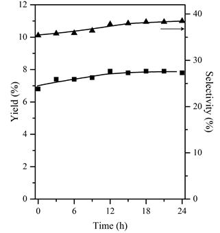 Catalytic stability of CoMoϕy873 was tested at 773 K in continuous reaction for 24 h (see Figure 7) and no loss of catalytic activity was observed. The average conversion value was 20.6%.
