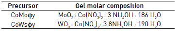 Bimetallic precursors were prepared using a co-precipitation method and were denominated CoMoϕy and CoWsϕy. The synthesis was carried out by preparing solutions of the metal salts, which were mixed and homogenized during the required time to form the gel. The salts used were Co(NO3)2*6H2O (Merk), (NH4)6Mo7O24*4H2O (Merk) and WO3 (Aldrich); tungsten oxide was dissolved with NH4OH, the NH4OH was also used as the precipitating agent. Next, the precipitating agent was added to the mixture, which was allowed to crystallize for 4 h at 353 K. In the end, the solids were recovered by filtration. Table 1 shows the molar gel composition of the precursor materials. The precursors were dried in a convection oven at 373 K. The final catalyst was obtained from calcination of the precursors at the temperatures that were chosen based on the thermal behavior shown below. Calcination temperature was defined at 673 K for CoWsϕy and at 623 K for CoMoϕy.