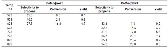 Figure 5(a) shows that CoMoϕy623 has a measurable catalytic activity from 523 K and CoWsϕy673 from 573 K. The propane conversions are relatively high (Figure 5(a)), taking into account the low temperatures at which catalytic activity was evaluated. The catalyst that presented the best performance, regarding conversion, was CoMoϕy623, with 18.5% conversion at 623 K, while CoWsϕy673 reached conversions smaller than 10% even at 673 K. However, selectivity (Figure 5(b)) at 623 K presents an inverse behavior to that observed with the conversion. Selectivity to propene for CoMoϕy623 tends to be stable at temperatures above 573 K, with a value close to 27%.