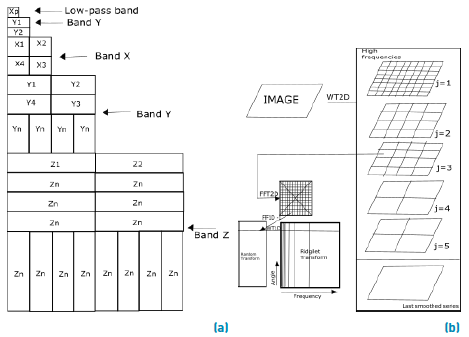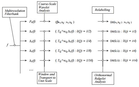 Figure 2 shows a schematic representation of the processes involved in the Curvelet and Ridgelet transforms, using DBF for the multiscale decomposition and applying the Ridgelet transform.