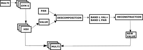 The first component is extracted from the resulting coefficients of the panchromatic image and it is replaced on the Value.