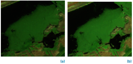 Figure 8 presents a body of water with aquatic vegetation inside the study zone. The results for the universal quality index applied to the fused images using Curvelet and Ridgelet are the best. In this image [Figure 8(b)), better defined coverages can be observed since the areas with less aquatic vegetation tend to mix.