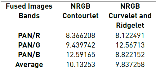 Table 1 shows the results after calculating the spatial ERGAS index. As can be observed, the best values, on average, correspond to the image obtained with the Curvelet and Ridgelet transform. For this image, the red canyon exhibits the best index (i.e. 8.12). Likewise, it was evident that the image obtained using the Contourlet transform showed the lowest values.
