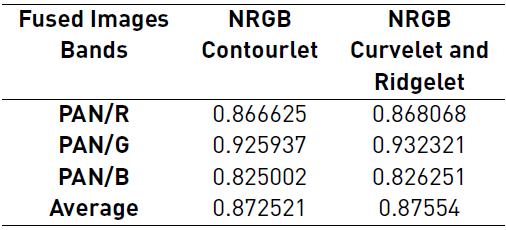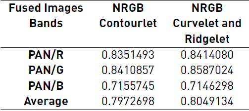 The results of the Qu index can be seen in Table 2. It is evident that the values associated to the generated images obtained with the Contourlet and Curvelet transforms preserve the spectral resolution and yield little loss of correlation with respect to the original image, where the values of the three RGB bands are close to 1, namely with indexes 0.84, 0.85 and 0.80 (see Table 2].