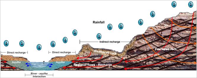 To adequately administer the resources that exist in aquifers, it is necessary to have a detailed knowledge of how the water flows occur in the soil and rocks. Additionally, to understand aquifer recharge and discharge, it is necessary to look at the boundary conditions that define the input and output flows to these units. Figure 1 is a diagram of these external boundary conditions and the way water can flow into an aquifer. The infiltration of water from precipitation to an aquifer can occur by direct recharge, indirect recharge from regional flow, and/or through flow from bodies of surface water. Direct recharge occurs when the water gains access by vertical percolation through an existing unsaturated zone above the aquifer. Indirect recharge from regional flow occurs by infiltration through permeable strata, weathered or fractured rocks. Finally, the recharge from surface bodies can arise from the interaction between surface water sources and the hydrogeological unity.
